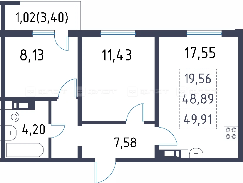 - 49.91/19.56/17.55 м²